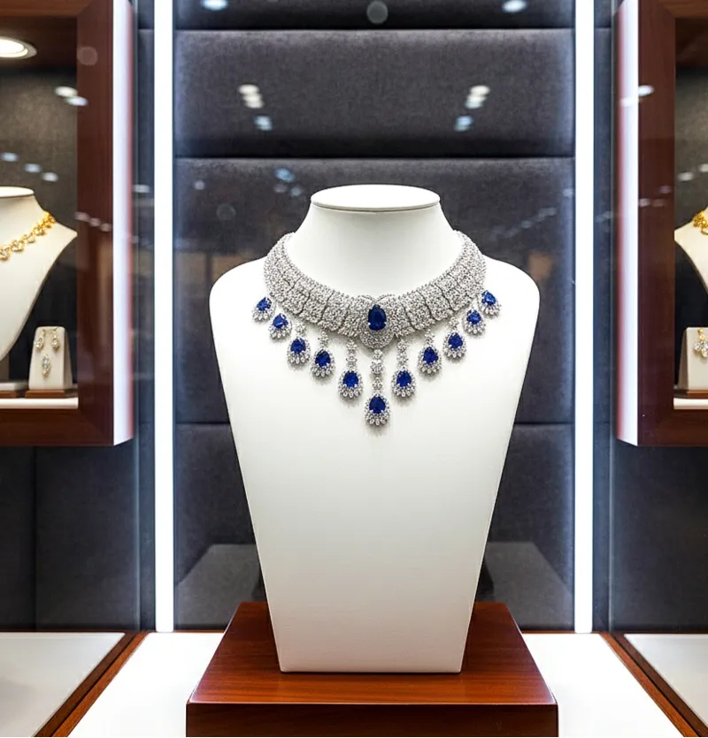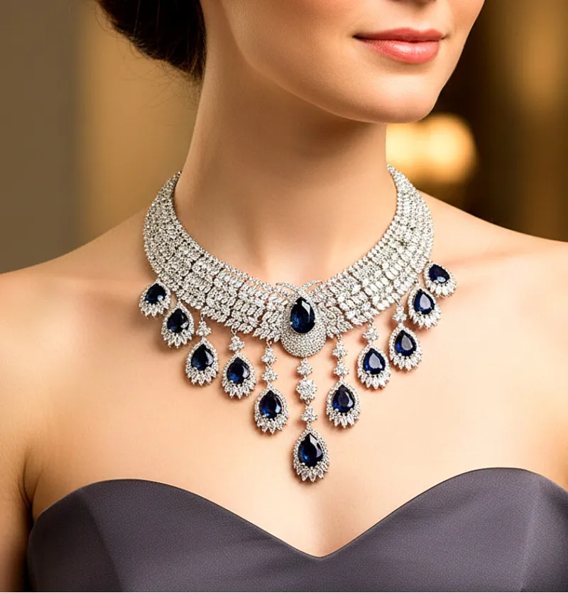 این گردنبند پهن که با آویز های یاقوت کبود بسیار زیبا شده
